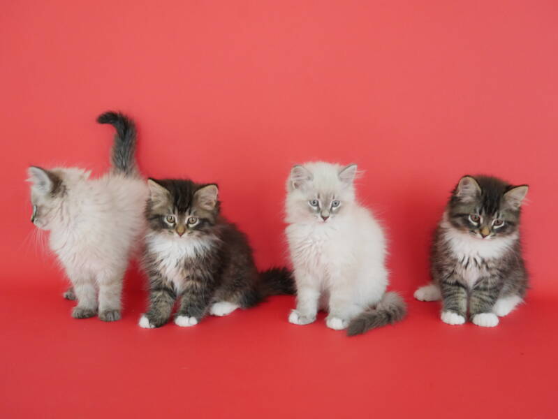 1 seal tabby point poesje, 1 blue tabby point met wit poesje, 1 black tabby met wit kater en 1 black tabby met wit poesje